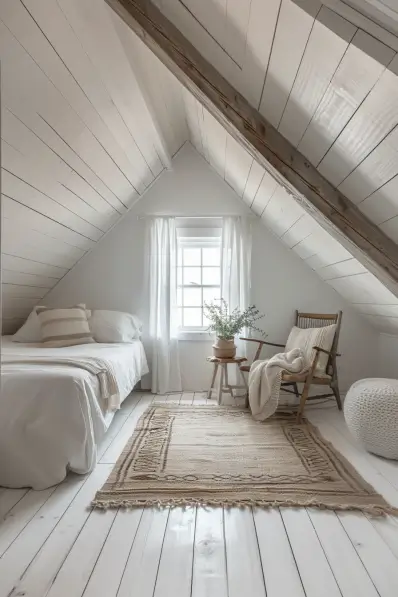 This light and airy attic bedroom exudes a calming and serene atmosphere. The sloped ceiling and exposed wooden beams add rustic charm. White walls and floors enhance the sense of space and brightness. A cozy bed is placed against one wall, while a small woven chair and pouf create a comfortable seating area. The space is minimally decorated with a simple rug, a few cushions, and a potted plant, maintaining a clean and uncluttered look.