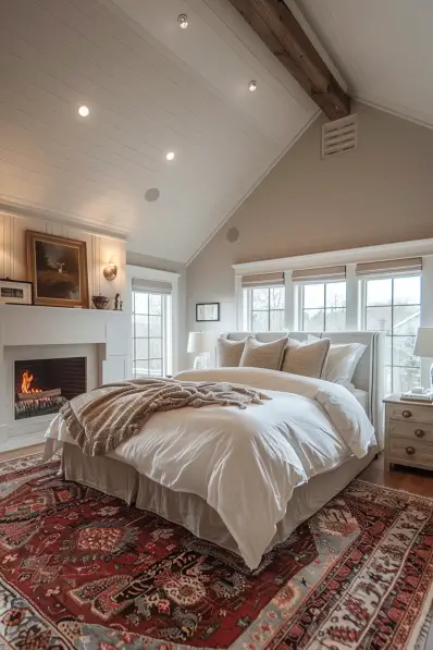 This attic bedroom exudes warmth and comfort. The sloped ceiling features exposed wooden beams that add rustic charm. The walls are painted a soft beige, enhancing the natural light that pours in through the windows. A plush white bed takes center stage, adorned with cozy throws and cushions. A fireplace adds a touch of luxury, perfect for chilly evenings. The rich, patterned rug provides a pop of color and ties the room together.