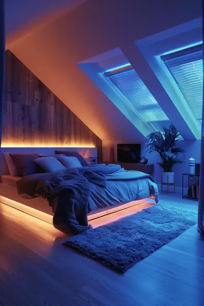 This attic bedroom features a modern design with LED lighting under the bed and around the headboard, creating a warm, inviting glow. The room is accented by two skylights that bring in natural light during the day and offer a view of the stars at night. Soft textiles and a cozy rug enhance the comfort of the space, while a potted plant adds a touch of greenery.