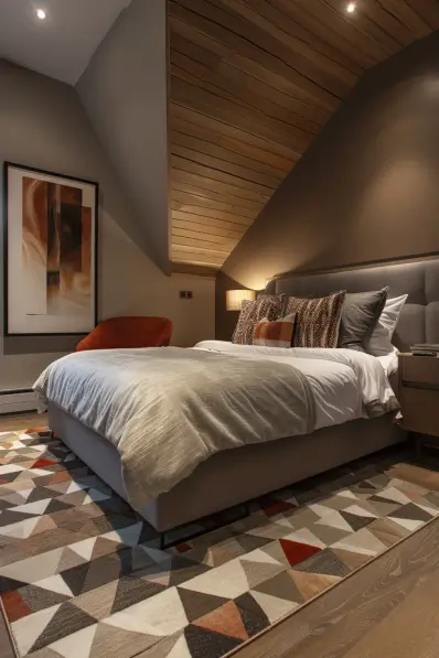 I find this room to be both modern and comfortable. The geometric rug adds a playful touch, and the earthy tones create a calming environment. This design is perfect for anyone seeking a contemporary yet warm bedroom that makes the most of an attic’s unique angles.