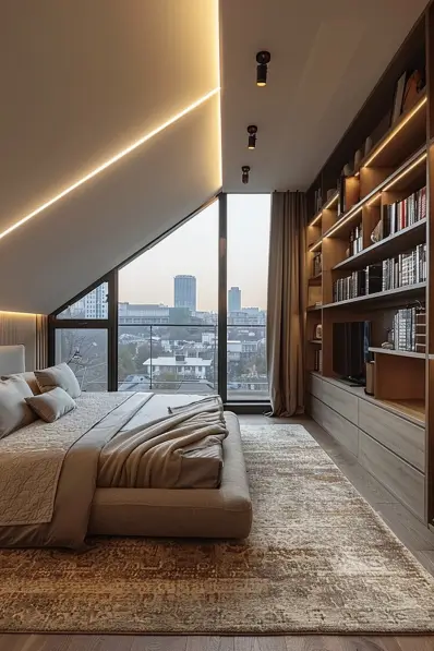 This attic bedroom combines sleek modern design with functional elegance. The sloped ceiling features integrated lighting that adds a contemporary touch. Large windows provide a stunning view of the city skyline, flooding the room with natural light. The bed, low to the ground, exudes minimalist charm, complemented by neutral bedding. A built-in bookshelf spans the length of one wall, perfect for displaying books and decor items. The room feels spacious yet cozy, with a soft rug adding warmth underfoot.