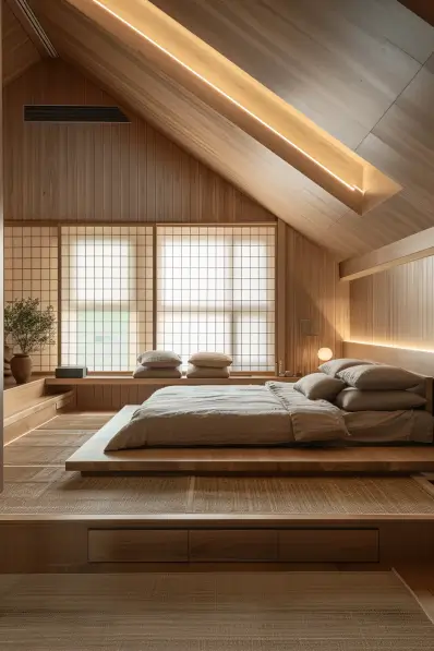 This attic bedroom showcases a minimalist design with Japanese-inspired elements. The space features warm wooden paneling and a low platform bed, creating a serene atmosphere. Soft, diffused light filters through shoji screen windows, enhancing the tranquil vibe. The room also includes built-in storage and a small sitting area, making efficient use of space.