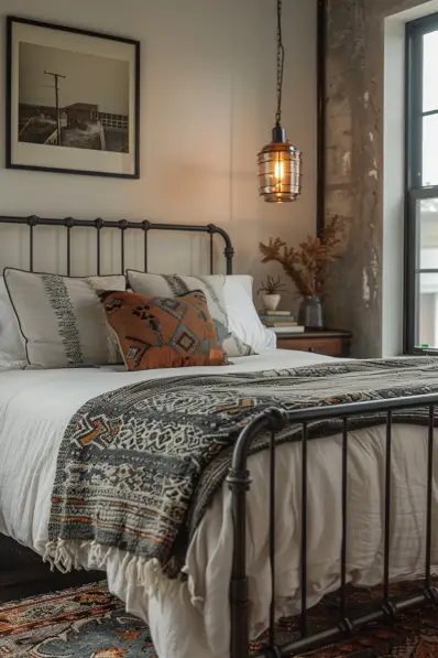 This bedroom combines industrial and boho styles seamlessly. The iron bed frame, concrete wall, and exposed light fixture give the room an industrial feel. Meanwhile, the bed’s layers of patterned blankets and pillows add a cozy, boho touch. A simple yet elegant setup of dried foliage in a vase on the bedside table completes the look.