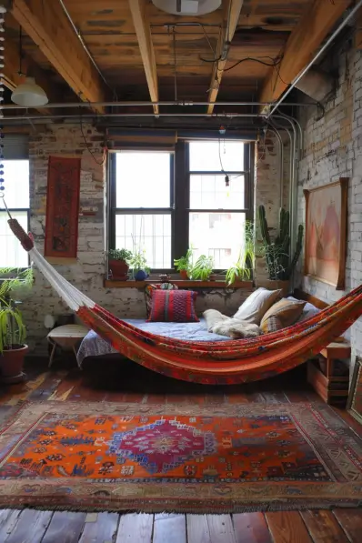 This setup is ideal for city dwellers who want to bring a touch of bohemian charm into their urban space. The hammock offers a fun and unconventional seating option, perfect for relaxation or reading. The combination of industrial elements with boho decor makes this room both stylish and inviting.