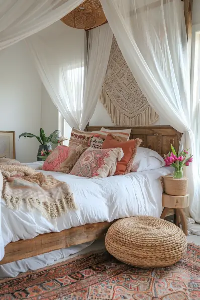 This bedroom features a serene boho aesthetic with a cozy canopy bed as the focal point. The light, airy canopy drapes around the bed, creating a soft, inviting space. A mix of textured pillows and throws in earthy tones adorns the bed, complemented by a woven ottoman and a rustic wooden headboard. The room is bright and filled with natural light, with delicate decor elements like potted plants and fresh flowers adding a touch of nature.