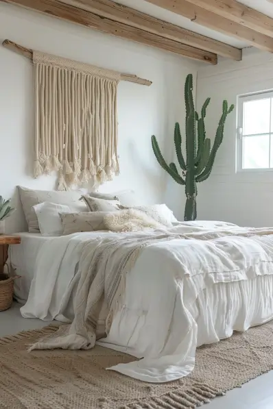 This bedroom exudes a calm, desert-inspired vibe with its minimalist boho decor. A large, soft bed covered in white linens is the focal point, accented by a variety of cozy throws and pillows. The wall above the bed features a large macramé hanging, adding texture and interest. A tall cactus plant stands in the corner, bringing a touch of greenery and desert charm to the room. The natural wooden beams on the ceiling and the woven rug under the bed enhance the earthy, serene feel of the space.