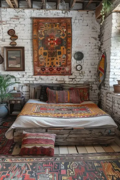 This boho bedroom blends eclectic and rustic elements. Exposed white brick walls provide a raw, urban backdrop for the vibrant textiles that adorn the space. A colorful woven tapestry hangs above the bed, complemented by a mix of patterned pillows and a richly detailed bedspread. The bed itself rests on a simple wooden pallet, adding to the room’s laid-back, DIY vibe. Various decorative items, including framed pictures and woven baskets, are displayed on the walls, adding personal touches and visual interest.