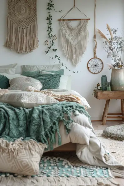 This bedroom captures the essence of boho decor with its layered textures and earthy tones. The bed is adorned with a mix of green and beige blankets and pillows, creating a cozy and inviting atmosphere. Macrame wall hangings and a dream catcher add a touch of bohemian charm, while the wooden side table holds delicate decor pieces and a vase with dried flowers. Soft lighting and a plush rug complete the serene and comfortable space.