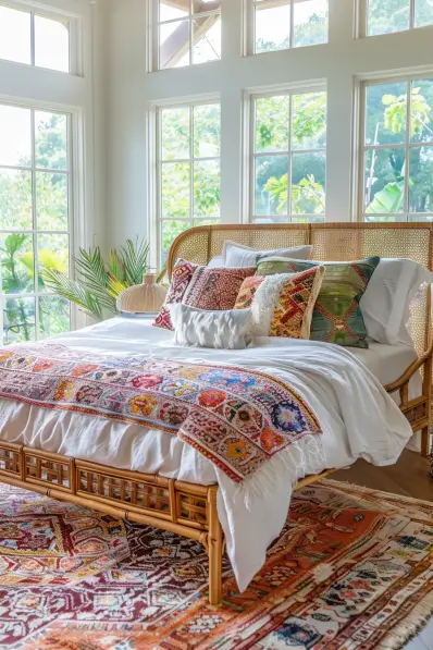 This boho bedroom is filled with natural light, creating a bright and airy atmosphere. The rattan bed frame adds a touch of rustic charm, while the colorful, patterned bedding brings in vibrant bohemian elements. Large windows offer views of lush greenery, enhancing the connection with nature. A mix of throw pillows and a patterned rug add layers of texture and warmth to the room.