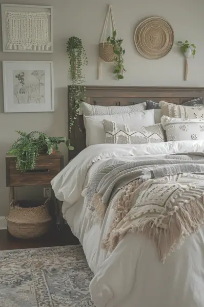 This cozy boho bedroom features a palette of soft neutrals, creating a calm and inviting space. The bed is adorned with layered blankets and textured pillows, adding warmth and comfort. Wall decor includes hanging plants, woven baskets, and framed botanical prints, bringing a touch of nature indoors. The wooden nightstand and woven basket further enhance the rustic bohemian vibe.