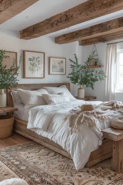 This bedroom showcases a rustic boho style with exposed wooden beams and a wooden bed frame, creating a warm and inviting atmosphere. The bed is dressed in crisp white linens, layered with soft throws and cushions for added comfort. Botanical prints on the walls and fresh greenery in vases bring a touch of nature indoors, enhancing the bohemian vibe. A patterned rug adds texture and ties the room together.