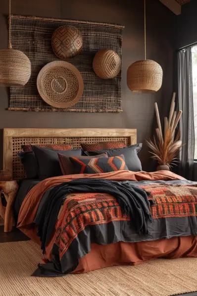 This bedroom highlights earthy boho elegance with a rich, warm color palette and eclectic decor. The bed is adorned with deep orange and charcoal linens, accented by a woven headboard. Above the bed, a tapestry and woven baskets add texture and visual interest. Hanging rattan lamps and dried pampas grass in a vase complete the earthy look. The natural fiber rug adds a cozy, grounded feel to the space.