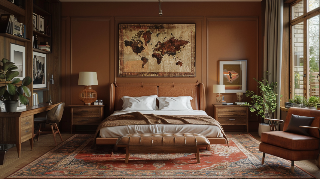I think this room is perfect for those who appreciate mid-century modern design. The warm brown tones create a welcoming atmosphere, and the vintage touches add character. It’s ideal for anyone looking to blend classic style with contemporary comfort in their bedroom.