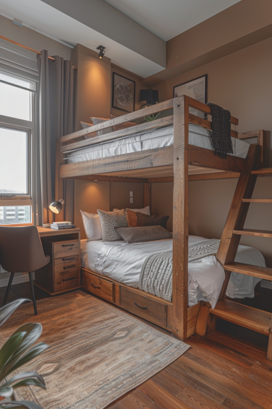 This bedroom makes excellent use of space with a cozy bunk bed design. The wooden bunk beds are complemented by warm brown walls and soft lighting. The lower bed features built-in storage drawers, adding functionality. A small desk area with a comfortable chair and stylish decor makes the room practical and inviting. Natural light from the window brightens the space, enhancing its cozy atmosphere.