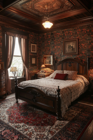 I think this room is perfect for those who appreciate classic, vintage style. The detailed decor and rich brown hues create a sophisticated and nostalgic atmosphere. It’s ideal for anyone looking to create a bedroom that feels like a step back in time, offering both elegance and comfort.