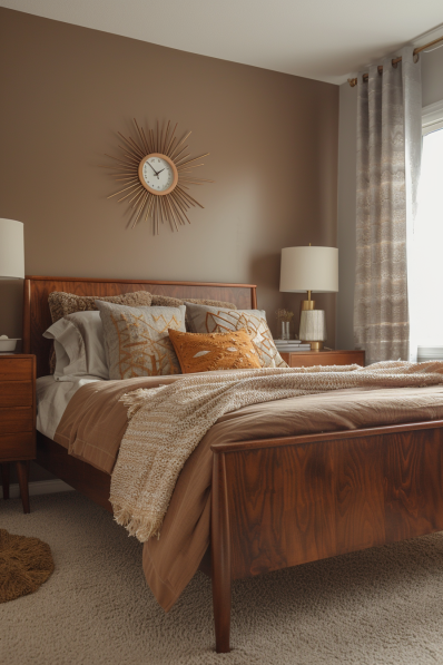 This bedroom features a mid-century modern design with rich brown tones. The wooden bed frame and matching nightstands add a classic touch. Soft linens in various shades of brown and cream create a warm, layered look. A sunburst clock above the bed adds a vintage flair, while patterned curtains and a textured throw bring in additional style elements. Natural light from the window brightens the space, making it feel cozy and inviting.