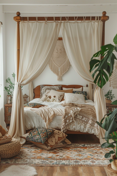 This bedroom showcases a bohemian style with warm brown tones and eclectic decor. The wooden canopy bed is draped with light curtains, creating a cozy, intimate space. Various patterned pillows and throws add layers of texture and color. The room features macrame wall hangings and lush green plants, enhancing the boho vibe. A patterned rug and woven basket complete the look, adding warmth and character.