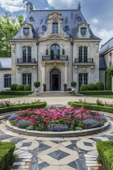 This classic French house design is the definition of polished charm. The soft-toned facade is dressed in elegant stonework, with arched windows and decorative carvings that give the whole home a refined, regal feel. Two petite balconies with wrought iron railings sit above the entry, adding that perfect touch of Parisian flair. In front, a circular stone garden bursts with blooming flowers in soft pinks and purples, bordered by neat hedges and a patterned walkway that guides your eye straight to the grand arched doorway.