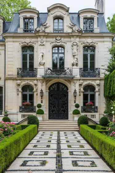 This classic French house design is pure enchantment. The limestone facade is richly decorated with sculptural flourishes, from intricate carvings above the entry to ornate balustrades on the balconies. Arched windows with wrought iron accents balance the structure beautifully, while soft ivy wraps around one corner like nature’s jewelry. But the real fairytale moment is the garden path. A crisscrossed walkway of stone and moss leads through rows of blooming blush roses and manicured hedges that frame the scene like a painting.