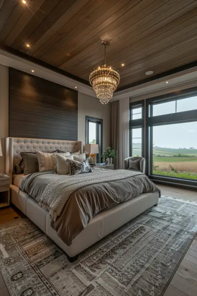 I love the blend of rustic and elegant elements in this bedroom. The wooden beams and paneling create a cabin-like feel, while the chandelier and detailed rug add sophistication. This design is ideal for those who appreciate a warm, inviting space with a mix of country charm and refined touches.