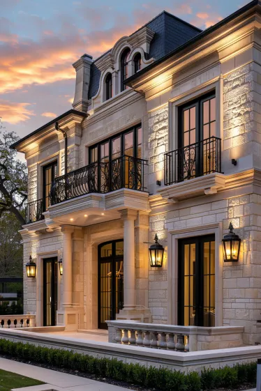 Some homes are built to make a statement, and this majestic limestone estate is a masterpiece of French elegance. The grand arched entrance, intricate stone carvings, and wrought-iron balconies create a look that is both classic and imposing. Tall black-framed windows contrast beautifully with the pale stone exterior, while the balustrade-lined terrace adds a luxurious touch. Every detail, from the ornate lanterns to the sculpted iron railings, speaks of timeless sophistication.