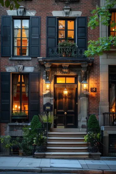 Some homes just have that timeless, elegant charm, and this stunning brick townhouse is a perfect example. The deep red brick facade, bold black shutters, and dramatic double-door entrance make a striking first impression. Intricate wrought-iron details on the balcony add a classic Parisian touch, while the warm glow of lantern-style lighting creates the perfect balance of sophistication and coziness. The grand stoop entrance, framed by lush greenery, makes this home feel both inviting and stately.