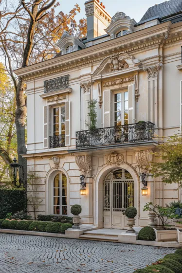 Some homes whisper sophistication, and this stunning Parisian estate is a perfect example. The creamy white facade, intricate stone carvings, and wrought-iron balconies create an air of effortless luxury. The arched entryway, framed by elegant lanterns, makes a grand first impression, while the tall French windows with delicate shutters add a touch of romance. The cobblestone driveway, manicured hedges, and soft lighting complete the picture of a home that is both regal and inviting—a true masterpiece in French City House Exterior Designs.