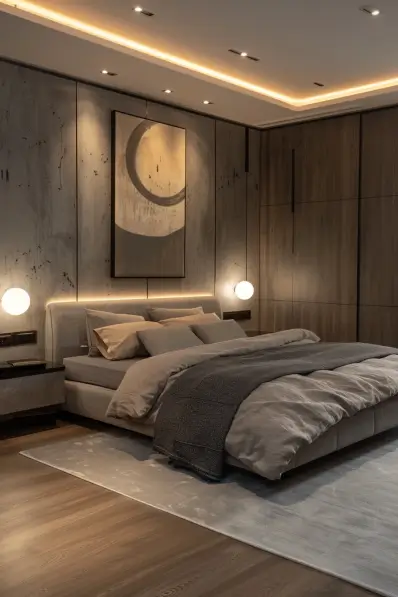 This warm grey bedroom features a sleek platform bed with neutral bedding, including shades of beige and grey. The accent wall behind the bed combines textured grey panels with warm wood tones, adding depth and interest. Modern round wall sconces provide ambient lighting, while recessed ceiling lights and a backlit headboard create a cozy and inviting atmosphere. A minimalist abstract painting above the bed adds a touch of artful sophistication.