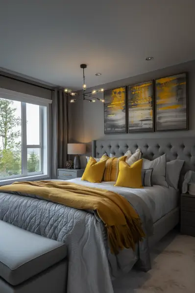 This grey bedroom features a stylish tufted headboard and soft grey bedding, complemented by bold yellow pillows and a matching throw. The walls are painted in a medium grey, creating a serene backdrop for the bright accents. Above the bed, a set of three abstract paintings in shades of grey and yellow add a splash of color and artistic flair. The room is well-lit by a modern chandelier, and natural light pours in through a large window with grey curtains.