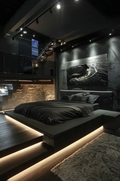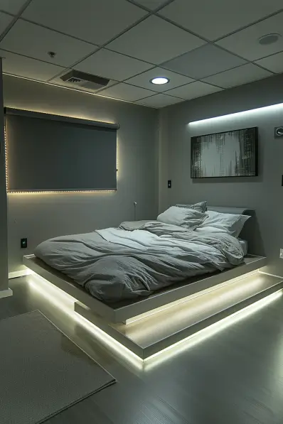 I think this room is both modern and intriguing. The LED lighting adds a unique and futuristic touch, making the space feel innovative. This decor idea is perfect for someone who enjoys a cutting-edge, minimalist style. It’s ideal for creating a bedroom that feels both sleek and inviting, with a touch of high-tech flair.