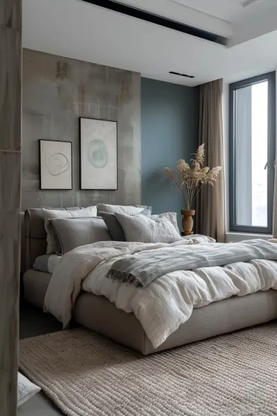 This cozy grey bedroom features a plush bed with soft grey bedding and a mix of light grey and white pillows. The accent wall behind the bed combines grey and earthy tones, adding warmth and depth to the space. Two simple, framed artworks provide a subtle yet elegant touch. Natural light streams in through the large windows, complemented by earthy decor elements like a vase with dried plants and a textured beige area rug.