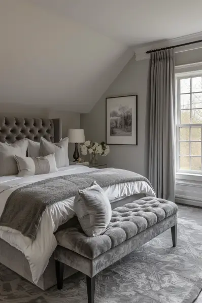 This classic grey bedroom features a plush, tufted headboard and a matching bench at the foot of the bed. The bed is dressed in crisp white linens and layered grey blankets, creating a cozy and elegant look. Soft grey walls and matching curtains provide a serene backdrop, while a large window allows natural light to brighten the space. A framed black-and-white landscape print above the nightstand adds a touch of sophistication.