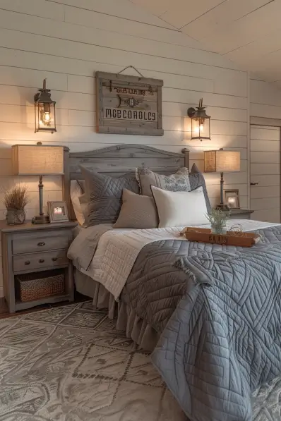 This rustic grey bedroom features a charming shiplap wall behind a cozy, grey-toned bed. The bedding includes quilted patterns in various shades of grey, creating a layered and inviting look. Rustic lantern-style lamps and vintage decor items add warmth and character to the space. A patterned area rug complements the room’s rustic feel, and a personalized wooden sign above the bed completes the look.