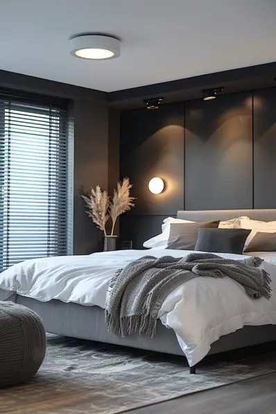 This contemporary grey bedroom features a stylish platform bed with crisp white bedding and grey accent pillows. The dark grey paneled wall behind the bed adds depth and sophistication, while modern lighting fixtures enhance the room’s sleek design. A textured area rug and a cozy grey throw blanket add warmth and comfort. The large window with black blinds allows natural light to filter in, balancing the dark tones.
