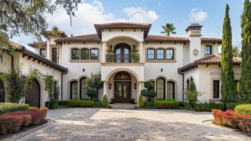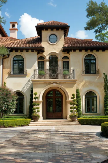 This Mediterranean masterpiece leans into formal elegance with perfect symmetry, grand archways, and stately wrought iron balconies. The central tower-like entry is framed by slender cypress trees and classical urns, leading up to a show-stopping arched double door with intricate ironwork. Every detail from the tall windows to the manicured boxwood hedges gives it a regal, European-inspired charm that feels both timeless and fresh.