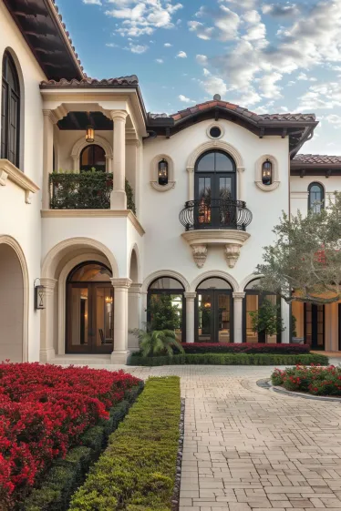This modern Mediterranean house blends timeless elegance with standout features that feel straight out of a fairytale. The rounded turret windows, detailed iron balconies, and stately columns give the exterior a grand, graceful feel. The white stucco walls make the perfect canvas for the lush greenery and bright red blooms spilling over the upper balconies. The landscaping is pristine and formal, but still warm and welcoming, just like a Mediterranean retreat should be.