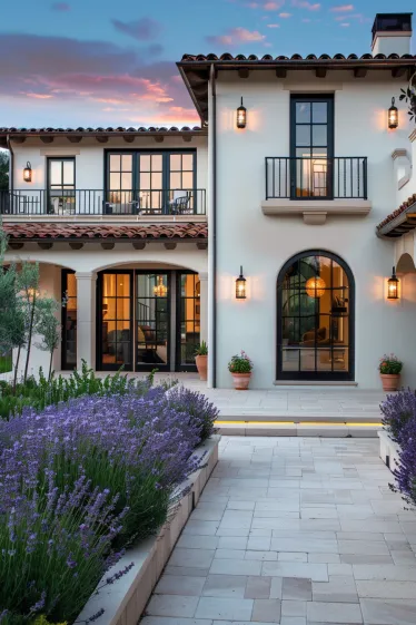 This modern Mediterranean house pairs crisp stucco walls with black-framed windows and rustic clay roof tiles, giving it that signature mix of old-world elegance and updated flair. The layout feels open and welcoming, with large arched windows and iron balcony details that draw your eyes up. But what really steals the show is the dreamy lavender garden lining the walkway. It softens the structure beautifully and adds such a romantic touch.