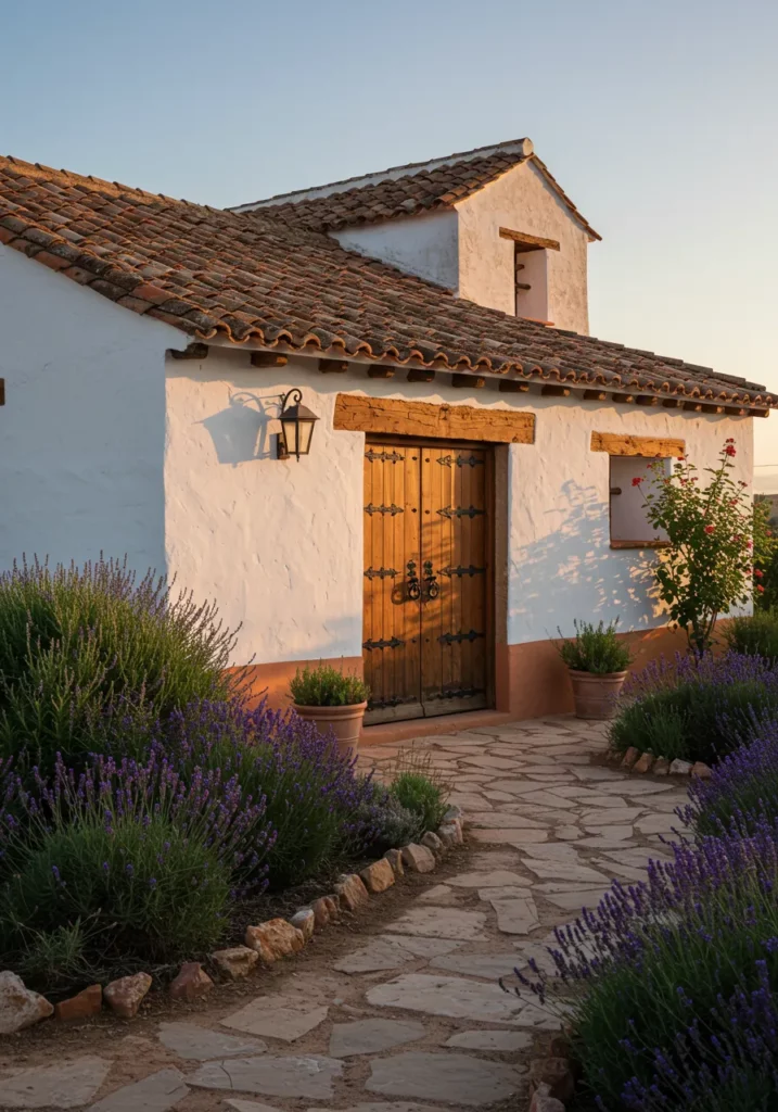 This quaint Spanish cottage offers a perfect blend of rustic charm and peaceful elegance. The whitewashed walls, topped with a traditional terracotta roof, create a cozy and inviting atmosphere. The front door, framed by intricately designed wooden panels, gives the home an old-world feel, while the surrounding lavender plants and stone pathway add to the tranquil ambiance. The simplicity of the design, combined with the beauty of nature, makes this home a serene retreat that is both practical and picturesque.