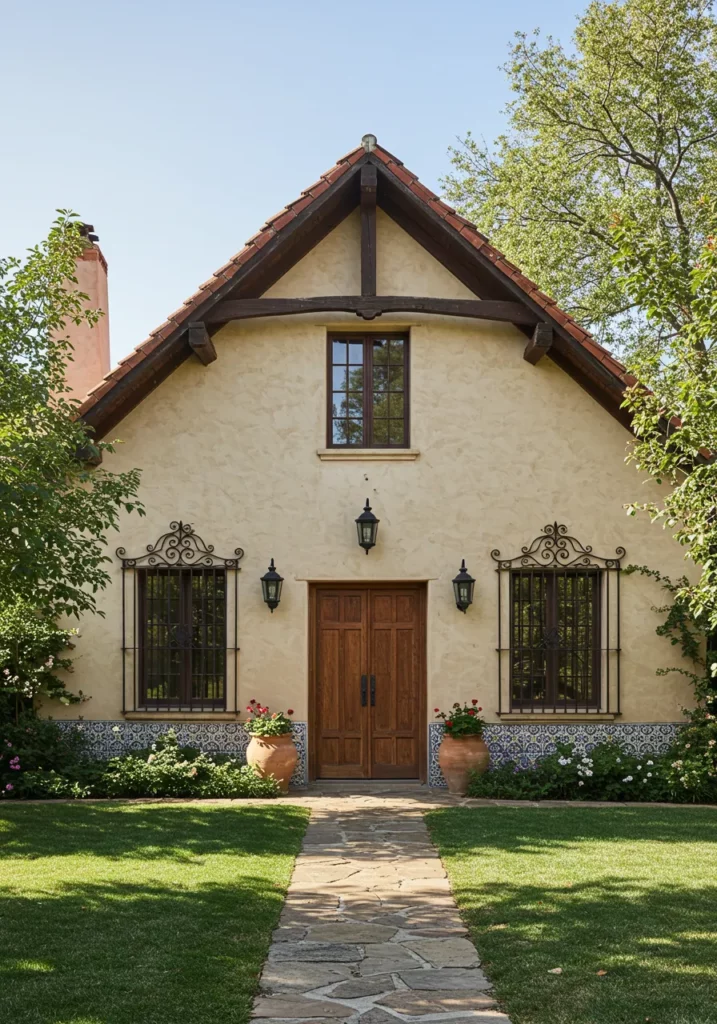 This charming Spanish cottage captures the essence of old-world elegance with its beautiful terracotta roof and natural stone façade. The home features stunning wrought-iron window grills, providing both security and character, while the intricate ceramic tiles along the base of the walls add a pop of color. The welcoming stone path leads to a rustic wooden door, making the entire exterior feel like an inviting retreat. The surrounding greenery, including the beautifully landscaped garden, perfectly complements the earthy tones of the architecture, creating a serene and peaceful atmosphere.
