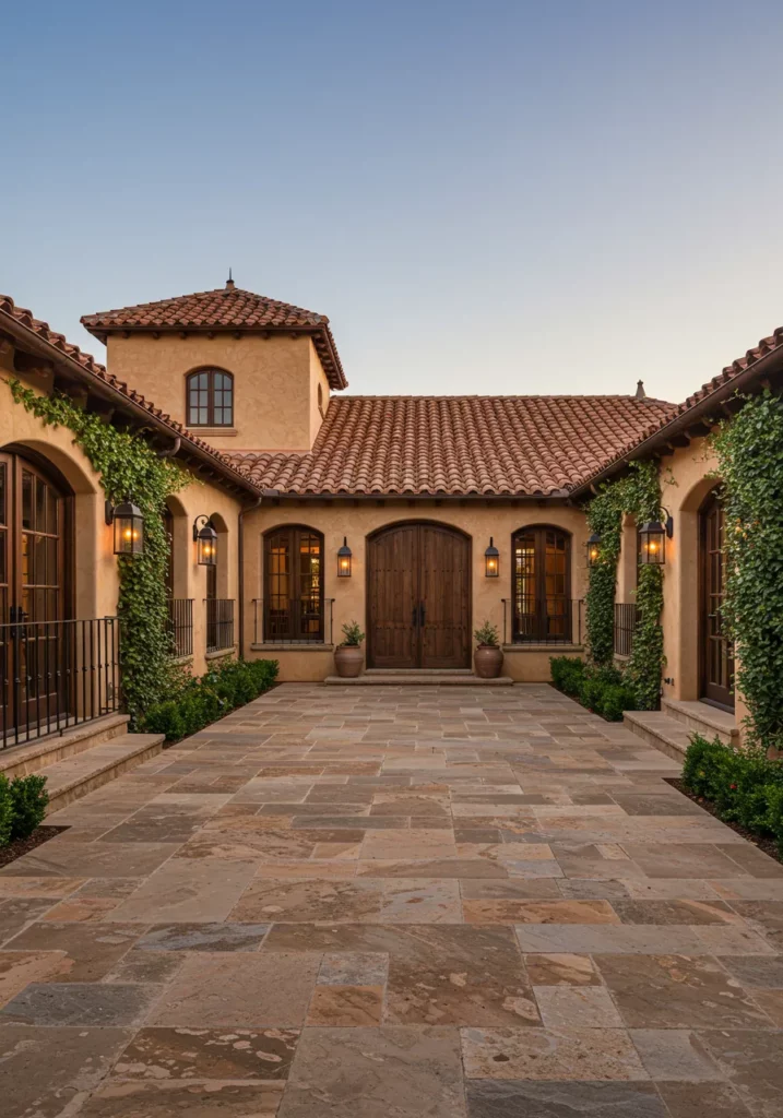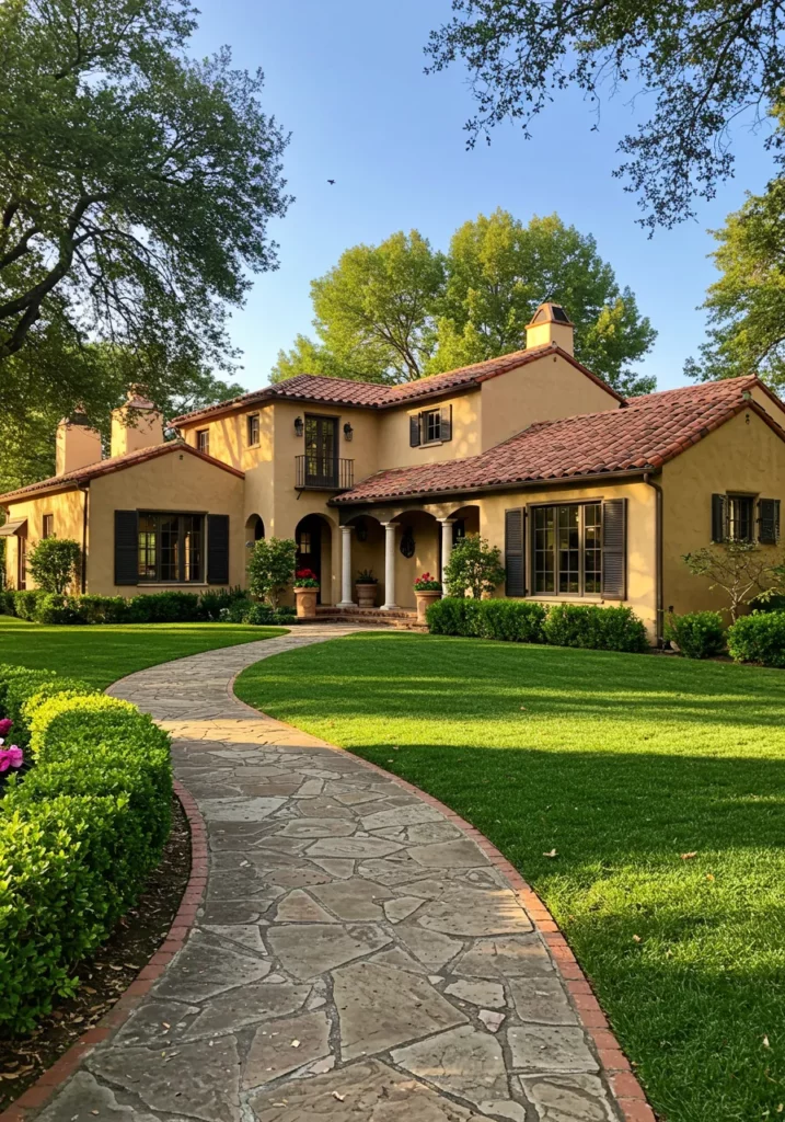 I love how this design effortlessly combines traditional Spanish elements with a fresh and welcoming vibe. The stone path leading to the front door is like an invitation, drawing you in to explore the space. The balance between natural elements like the ivy and the warm tones of the house creates a peaceful ambiance. It’s a design that doesn’t just look beautiful—it feels like a place where memories would be made, offering a perfect escape from the everyday hustle. It’s timeless and sophisticated, yet so warm and inviting!