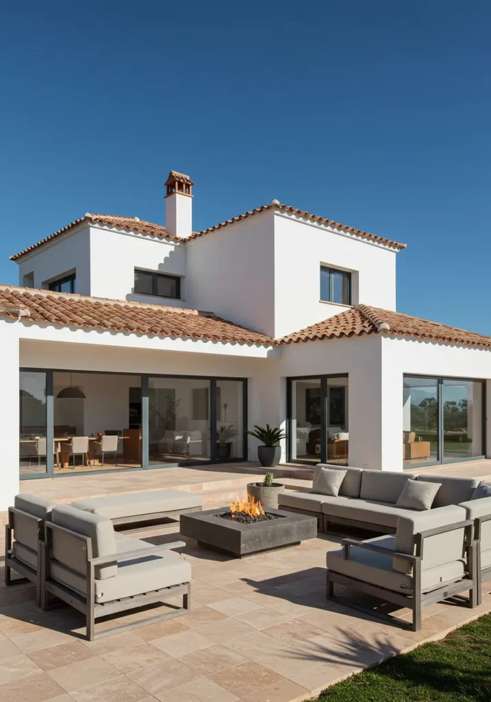This beautiful Spanish home combines traditional charm with modern elegance. The spacious, open layout features large glass doors leading to a cozy outdoor patio, complete with stylish outdoor seating and a firepit—perfect for relaxing or entertaining. The clean lines of the contemporary design are complemented by the warm terracotta roof, giving the home a traditional Spanish feel. The surrounding greenery and manicured lawn create a serene environment, with plenty of room to enjoy the outdoors in comfort and style.