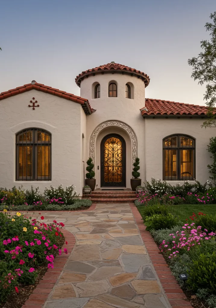 What really strikes me about this design is the balance it strikes between elegance and coziness. The design feels like a warm embrace, with those arched doorways and windows evoking a sense of history and romance. I love how the little details, like the iron door and the soft glow of the lanterns, create a welcoming and homey feel. It’s one of those homes that makes you feel immediately relaxed, as if you’ve stepped into a peaceful retreat. The gorgeous flower beds only add to the overall serene vibe—definitely a place I’d love to call home!