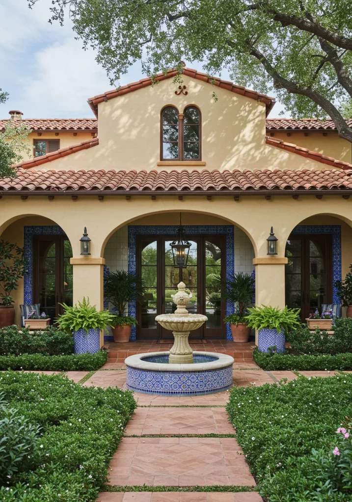 This exquisite Spanish home exudes warmth and charm with its beautifully detailed exterior. The terracotta roof and soft, earthy stucco walls create a classic Spanish feel, while the intricate ironwork on the windows and doors adds a touch of elegance. The lush garden, centered around a stunning stone fountain, creates a peaceful atmosphere. The path leading to the front door, lined with vibrant flowers, invites you into a home that perfectly blends timeless design with natural beauty.