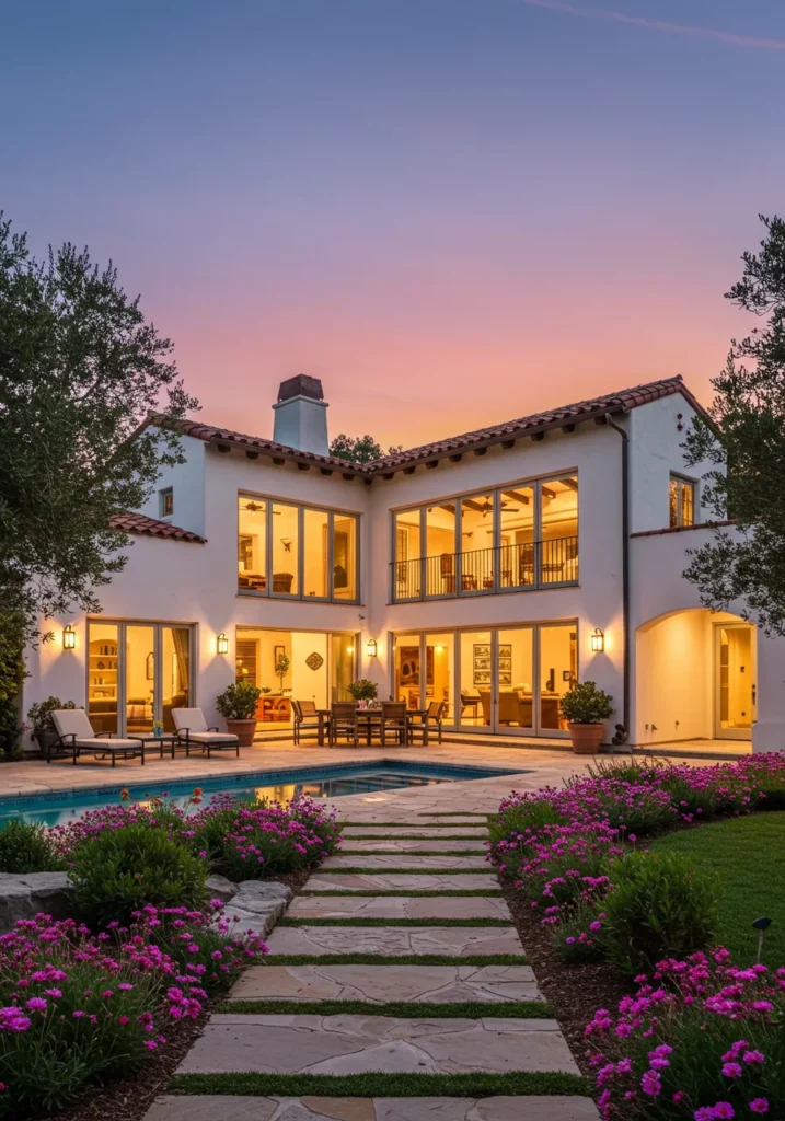 This stunning Spanish home beautifully integrates both modern luxury and traditional Spanish charm. The spacious outdoor area features a sparkling pool, with a stone pathway leading the way through a vibrant garden of pink and purple flowers. The warm, inviting lights from the windows and patio complement the natural beauty of the design, creating an atmosphere that feels like home. The wide glass doors seamlessly connect the inside of the home with the outdoor living area, showcasing the open, airy layout. The red-tiled roof adds an authentic Spanish touch, making the entire design feel balanced and welcoming.