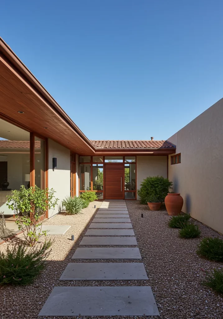 This modern Spanish courtyard home combines sleek design with traditional Mediterranean charm. The warm terracotta roof is complemented by the minimalist, soft-toned walls, and large windows flood the space with natural light. The clean lines of the architectural features, along with the simple yet elegant landscaping of the gravel and greenery, create an effortlessly chic look. The grand front door stands tall, framed by subtle landscaping, leading you down the stone path to a calm, inviting courtyard.
