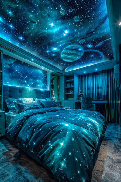 This bedroom transports you to another world with its stunning galactic theme. The ceiling and walls feature a mesmerizing starry night mural, complete with planets and constellations. The bed, covered in teal and star-patterned bedding, fits seamlessly into the cosmic decor. Soft lighting and teal accents throughout the room create a calming, otherworldly atmosphere. A small desk area with matching decor completes the look.
