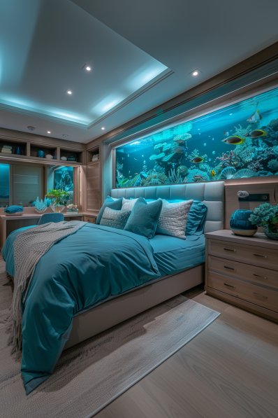 This bedroom transforms into an underwater haven with a stunning aquarium as the backdrop. The bed, adorned with teal and aqua bedding, complements the vibrant colors of the aquarium. Soft lighting under the bed and on the ceiling enhances the serene atmosphere. Natural wood elements and ocean-themed decor create a cohesive and calming space.